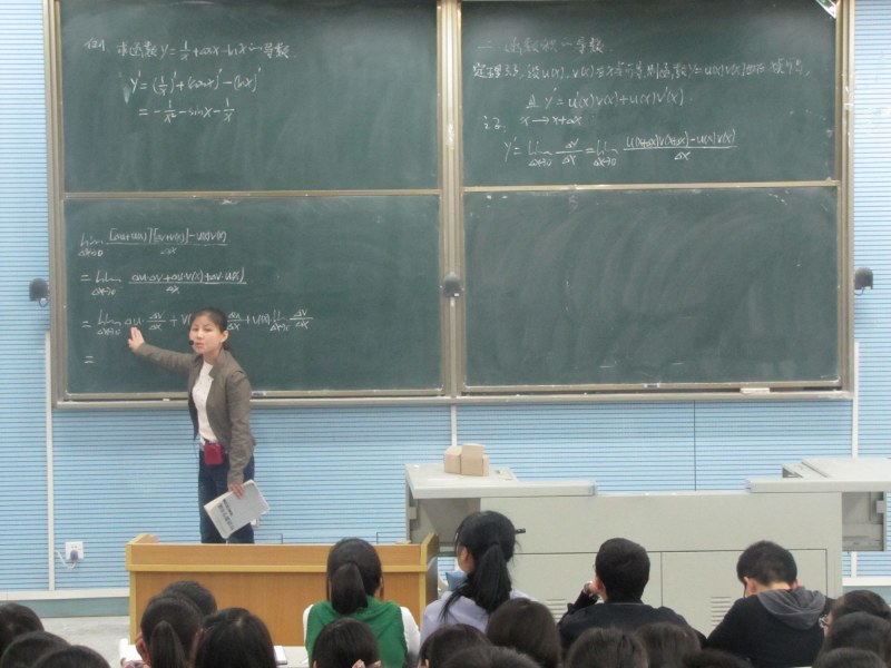 课堂上,杨美沂老师对导数的求导法则这一章节进行了详细的讲解,有定义说明,定理证明和例题详解,最后让学生们自主运用定理解答习题,举一反三,层层深入,让同学们对导数法则由一个相对陌生而困惑的局面到熟练运用知识的状态。杨美沂老师细致入微的讲解将枯燥无味的知识赋予了新的活力,同学们认真专注,课堂气氛活跃,师生互动积极。