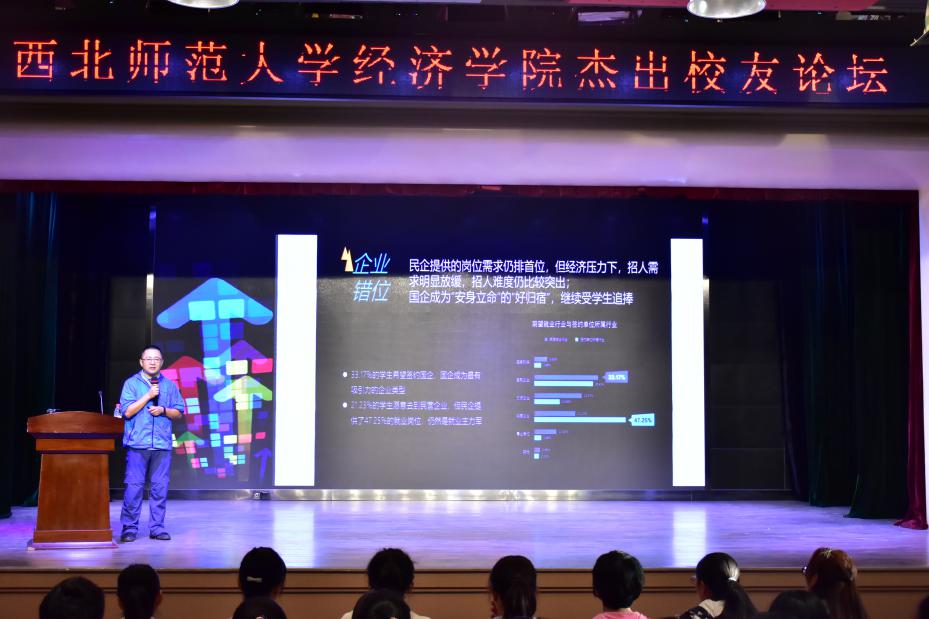 杨军经理的就业辅导专场报告分为三个部分:“苟且——数据分析”、“诗——面试技巧”、“远方——职业生涯”。杨军经理以自身经历为切入点,首先从毕业生最低薪酬、近年校招数据等方面分析当前就业形势,为同学们提出“看清趋势,选准行业,选好平台”的择业建议;其次,与同学们分享面试中“一鉴、二看、三听、四问、五评”环节,指导同学们在面试前做好充分准备,用心为自己定制简历。最后,杨军经理总结了优秀员工应具备的政治品德素质、能力素质、人格素质及健康素质,引导同学们以正确的、积极的就业心态努力提高自身能力储备,规划适合自身的发展道路。