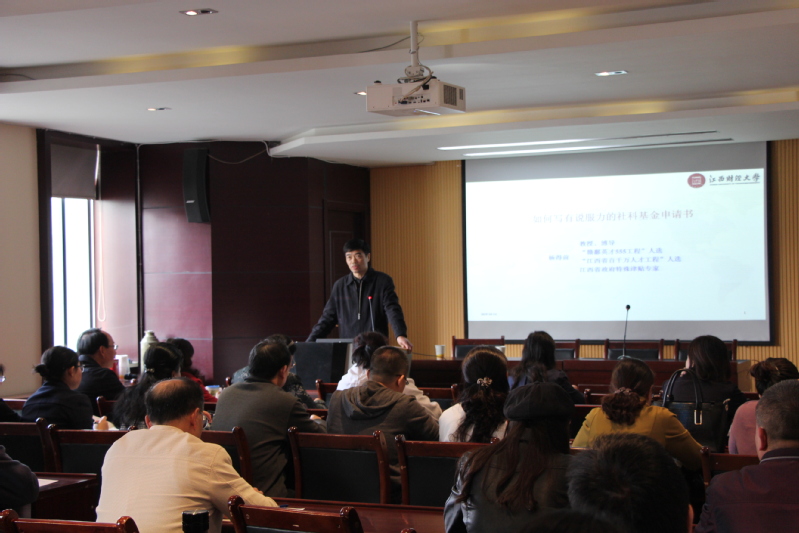 首先,杨得前教授从为什么要申请社科基金这个问题切入,从多个方面向我院教师阐述了申请社科基金的重要性。接着又提出问题:“什么样的申请书是有说服力的呢?”从形式和实质两方面为切入点,详细阐述了写申请书的一些细节问题。然后杨教授提出“三波攻击”,即从社科基金选题、研究内容再到研究基础来说服专家的三波攻击。关于选题,杨教授就选题的要求、选题的形成过程以及选题的依据进行了详细地讲解,同时结合自己的亲身经历,重点强调选题应尽量不要踏出自己的学科研究范围;关于研究内容,杨教授特别强调了重难点内容的两种写法,并且建议,能将重点、难点分开阐述不失为一种好的写法;关于研究基础,杨教授强调,一定要以国内顶级期刊的文献作为参考,与此同时,要将与课题相关的好的成果,以好的方式列出来。