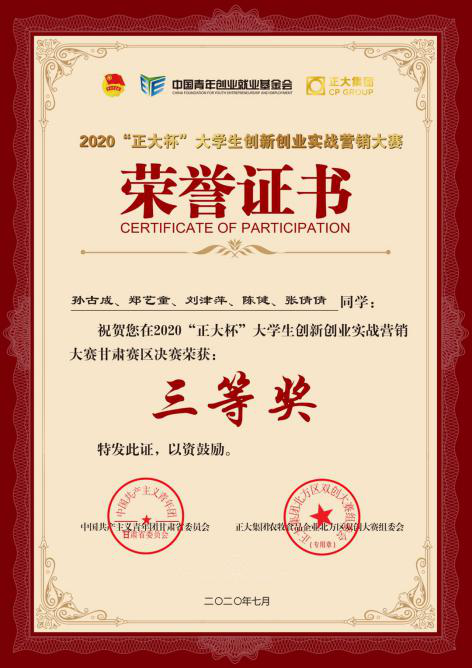 2020“正大杯”创新创业实战营销大赛甘肃赛区决赛落下帷幕。必赢线路检测中心周子毅、黄小娅同学获甘肃赛区二等奖,成功晋级北方赛区决赛;孙古成、刘津萍、郑艺童、陈健、张倩倩同学获甘肃赛区三等奖。
