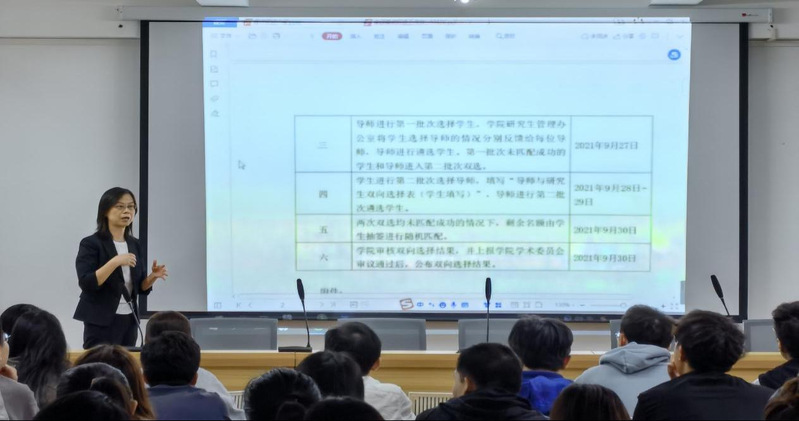 徐院长指出,为增强导师学术专长和学生研究兴趣的匹配度,充分发挥导师和研究生的积极性,经学院学术委员会讨论研究决定实行专硕研究生与导师双向选择确定指导关系。会上,徐院长详细介绍了导师双选制实行的具体方案,就双向选择原则、双向选择程序及时间节点进行详细讲解,同时向同学们介绍了硕士生导师信息查询的方式、导师简介以及指导名额分配的情况,确保师生双向选择工作公开、公正、科学有序地开展。