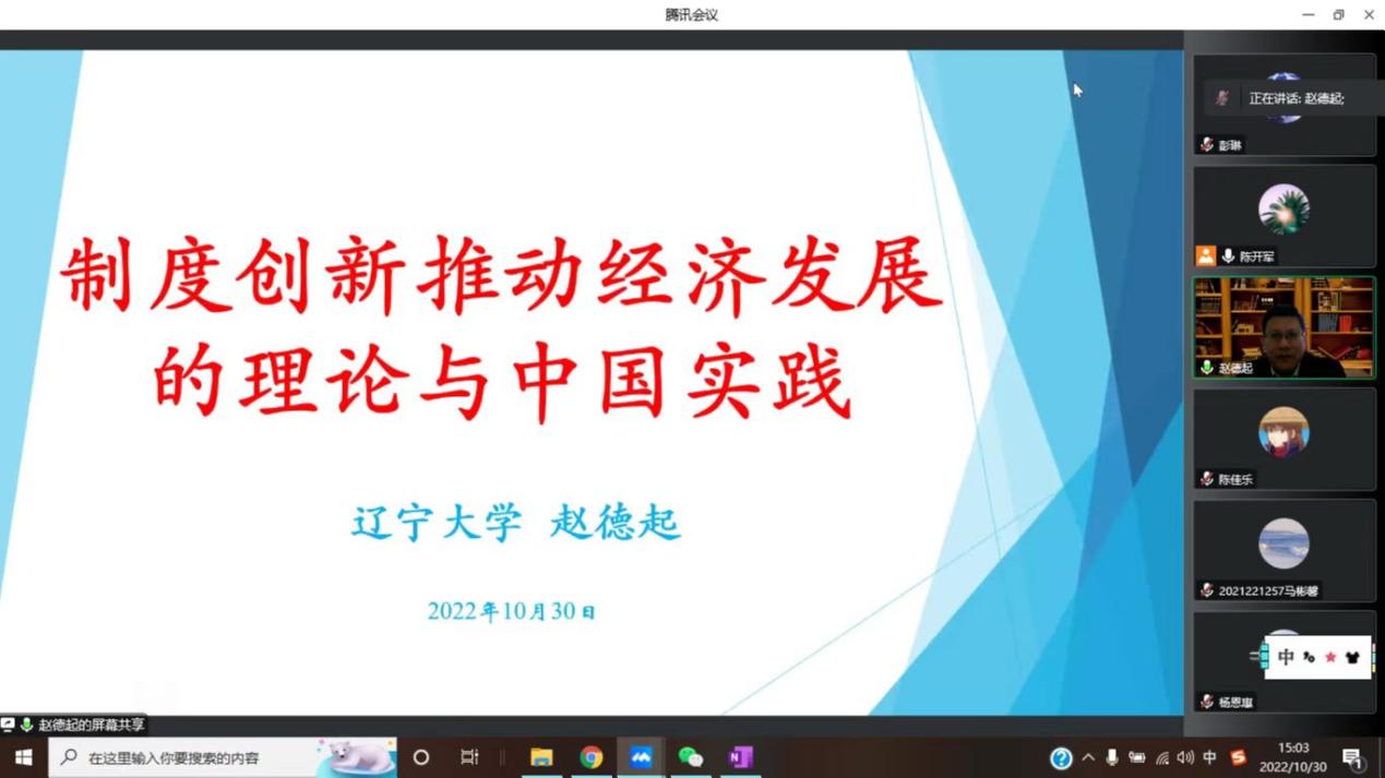 10月30日,应必赢线路检测中心邀请,辽宁大学亚澳商学院博士生导师赵德起教授为师生作了题为《制度创新推动经济发展的理论与中国实践》的线上学术报告。本次学术报告是西北师范大学百廿校庆博雅讲堂系列学术活动之一。报告会由陈开军副院长主持,学院师生150余人参加了报告会。