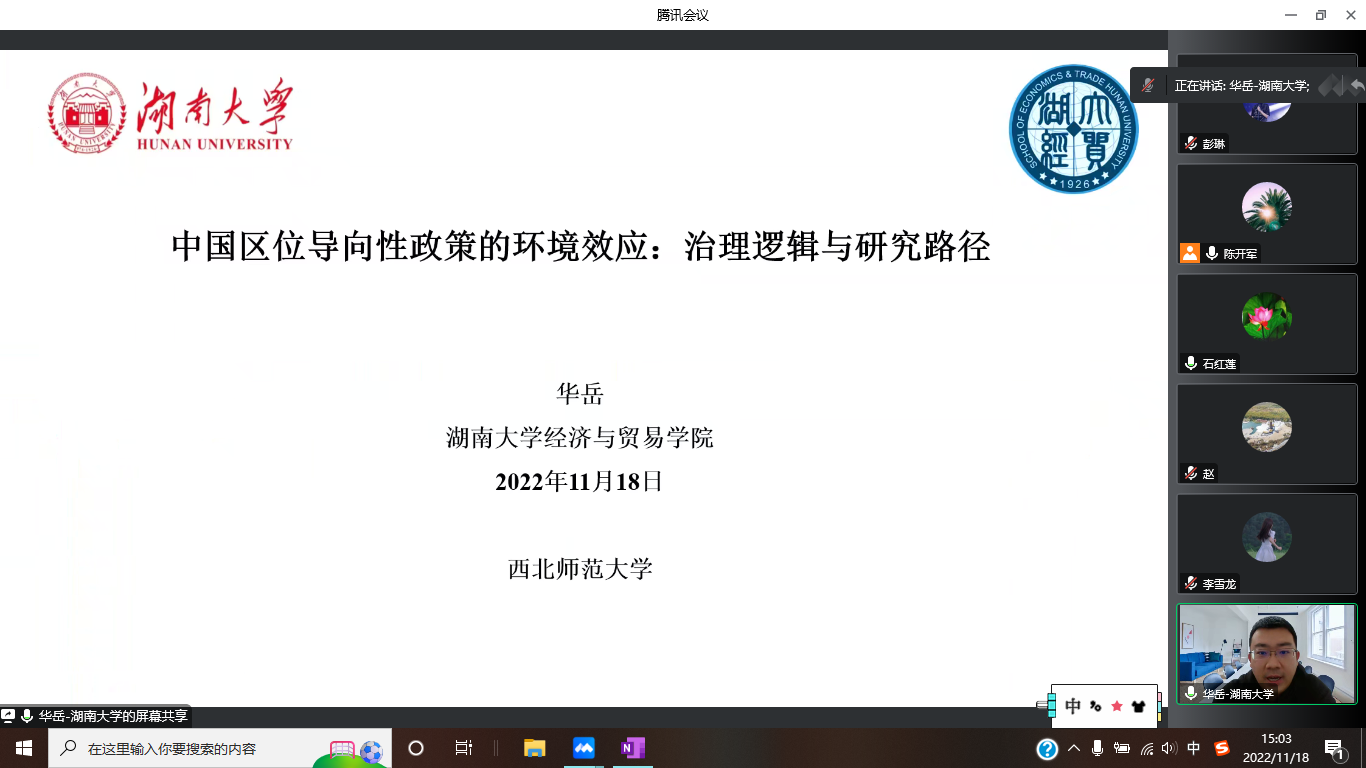 11月18日,应必赢线路检测中心邀请,湖南大学经济与贸易学院经济系主任华岳副教授为师生作了题为《中国区位导向性政策的环境效应:治理逻辑与研究路径》的线上学术报告。报告会由陈开军副院长主持,120余名师生参加了报告会。