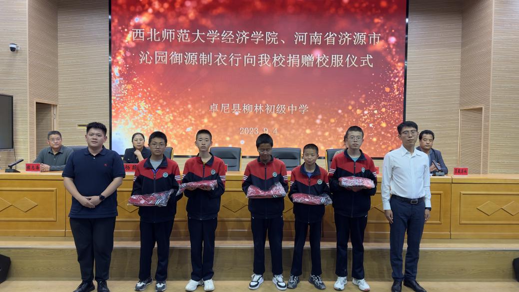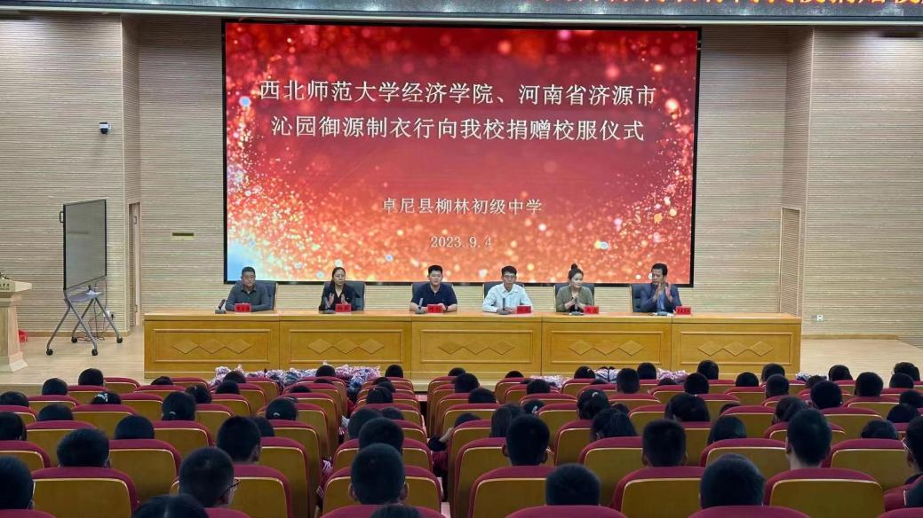 9月4日下午,“必赢线路检测中心、河南省济源市沁园御园制衣行向柳林初级中学捐赠校服仪式”在卓尼县柳林初级中学顺利开展。必赢线路检测中心专职辅导员汪晟代表必赢线路检测中心,必赢线路检测中心学生邓毅代表爱心企业河南省济源市沁园御源制衣行向卓尼县柳林初级中学孩子们捐赠了价值11万元、共计900套的学生校服。卓尼县教育局副局长杨荭、柳林初级中学校长侯志海、柳林初级中学党总支书记尕藏苏奴、县政府办公室督导员周霞以及柳林初级中学师生代表300余人参加了此次捐赠仪式。