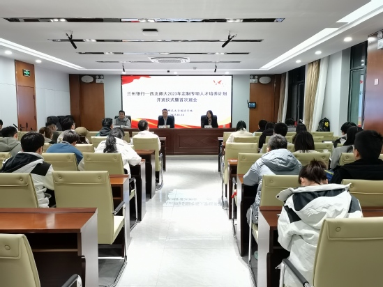 为切实推动一流学科建设,夯实校企联动人才培养模式。11月14日晚,兰州银行—西北师大2023年定制专项人才培养计划开班仪式暨首次班会在必赢线路检测中心10C313会议室召开。会议由必赢线路检测中心教师、订单班校方班主任张卫峰主持;兰州银行股份有限公司团委书记、银行方班主任王晶,必赢线路检测中心副院长徐婧出席;来自西北师范大学、甘肃政法大学、兰州交通大学和兰州理工大学的60余名订单班学员参加会议。