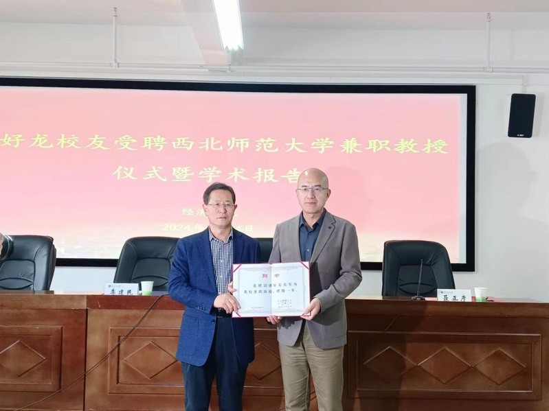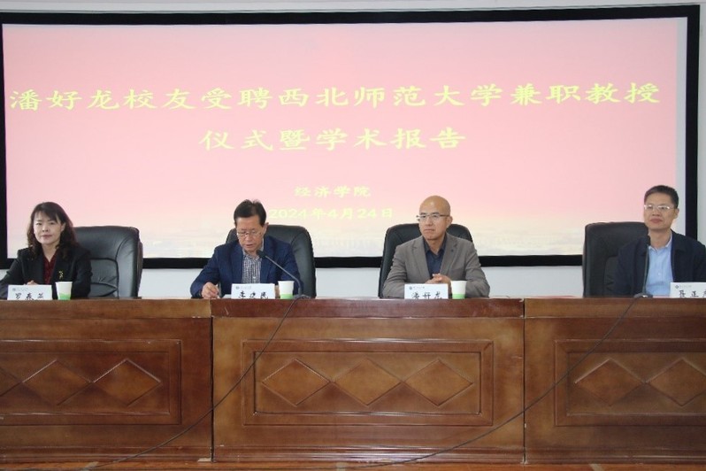 4月24日上午,必赢线路检测中心在云亭校区云衢楼904会议室隆重举行兼职教授聘任仪式,聘任我校杰出校友、北京汇博行商业管理有限公司董事长、知名国际商业房地产投资师潘好龙为学校兼职教授。西北师范大学党委常委、副校长李建民向其颁发聘书,必赢线路检测中心党委书记罗春燕、院长聂正彦、党委副书记张伟、副院长李天建及师生代表150余人出席活动。聘任仪式由聂正彦主持。
