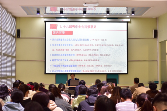 李建民从国内背景、国际背景和重要战略机遇三个方面讲述了十九届五中全会背景和重要意义。从“十三五”期间全面建成小康社会取得决定性成就、二〇三五年基本实现社会主义现代化远景目标、“十四五”时期经济社会发展指导方针和主要目标、必须遵循的原则以及完成“十四五”时期经济社会发展目标任务的十二条举措等方面全面、系统、深刻解读了十九届五中全会的重点内容。李建民强调,要加强党的全面领导和党的建设工作,为实现“十四五”规划和二〇三五年远景目标创造良好的国际和国内环境。李建民指出,学习宣传贯彻落实十九届五中全会精神是当前重要的政治任务,学院党委和各党支部按照“六个讲清楚”要求采取多种形式学习、领悟、践行十九届五中全会精神,着力推进一流学科建设,落实树人立德根本任务,加强科学研究,提高创新能力。